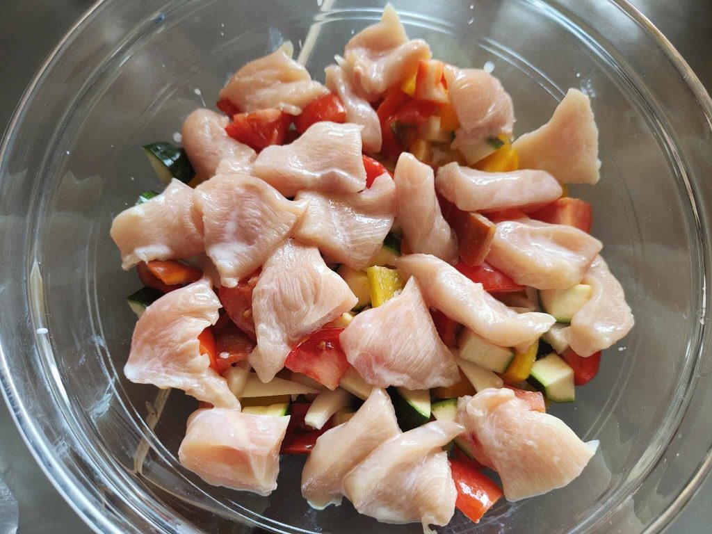 • Adicione o peito de frango cortado a todos os legumes cortados em pedaços.