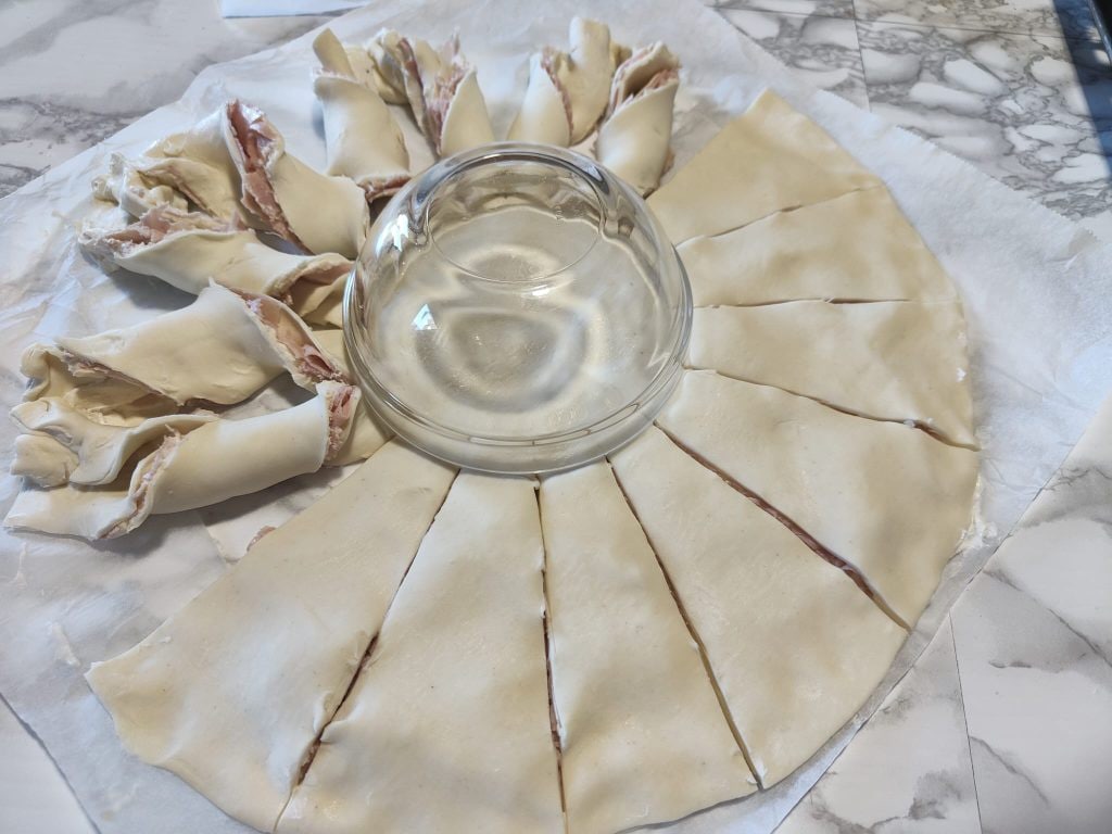 No centro da torta salgada, coloque sem pressionar demais uma tigela que tenha um diâmetro de pelo menos 15/16 cm, não muito pequena, caso contrário, você não obterá a forma de estrela.