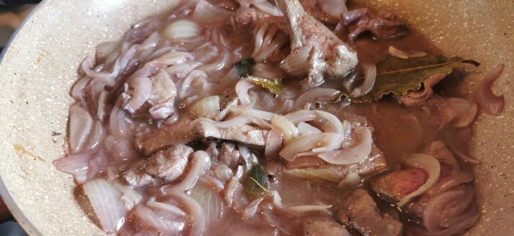 Adicione o vinho (ou o vinagre) e deixe evaporar completamente a parte alcoólica.