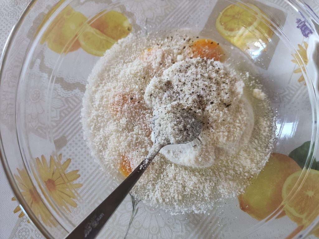 Agora, em uma tigela grande, bata com um garfo os ovos com o queijo ralado e a ricota com um pouco de sal e uma pitada de pimenta.
