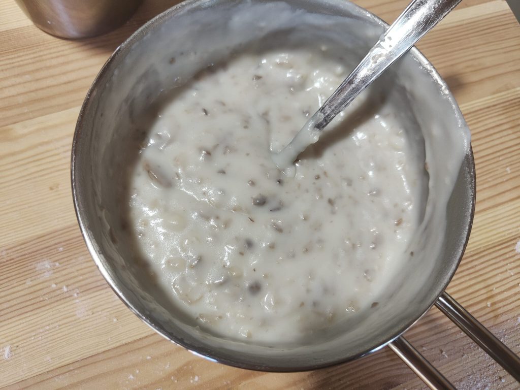 Retorne a panela ao fogo e mexa quando a mistura começar a adquirir uma leve cor dourada, incorpore o leite quente e mexa vigorosamente tudo com o batedor.