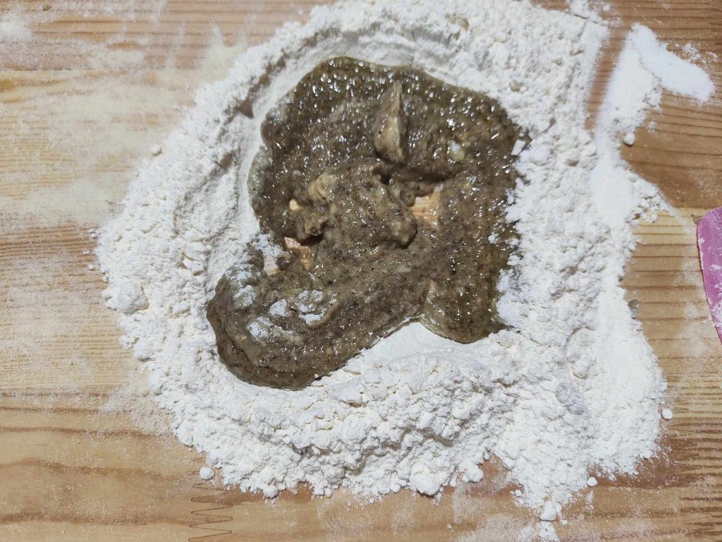 Adicione os cogumelos processados e trabalhe a massa por cerca de dez minutos, adicionando mais farinha se necessário.