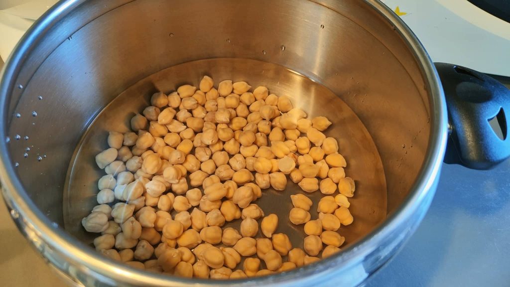 A recomendação é deixar os grãos-de-bico de molho por pelo menos 12 horas, cuidando de trocar a água pelo menos 2 vezes ao longo desse tempo.