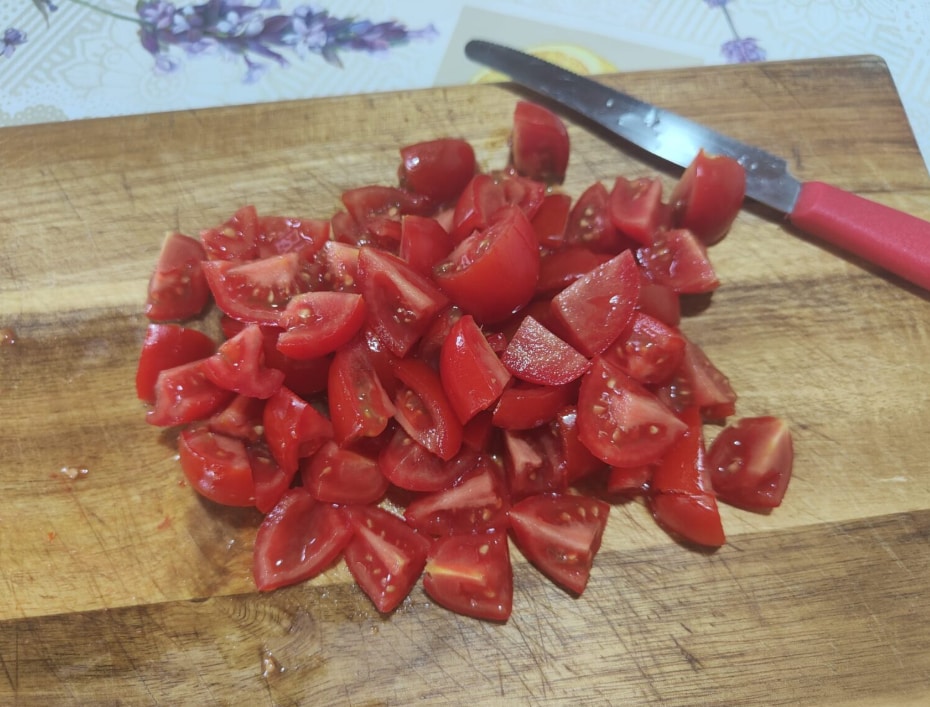 No lugar dos tomatinhos, você pode usar 3/4 tomates grandes.