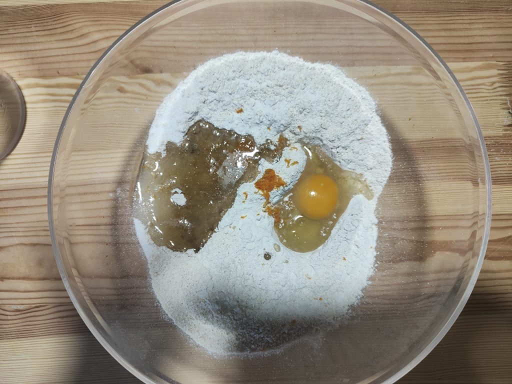Adicione o ovo, o óleo de sementes, o açúcar eritritol e o fermento em pó.