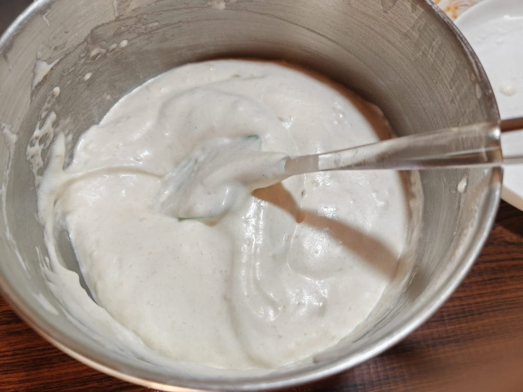 Depois adicione a farinha, misture com a batedeira para remover quaisquer grumos.