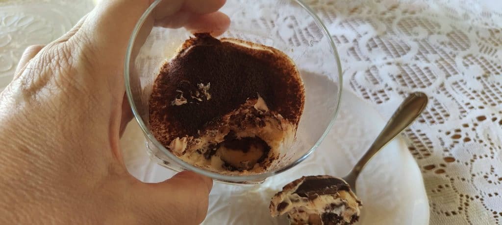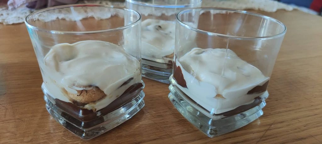 Café, biscoitos champagne e iogurte grego, duas colheres de sopa de açúcar de confeiteiro para torná-lo ainda mais irresistível e ao mesmo tempo dar uma nota crocante, adicionei camadas de chocolate amargo …….para um resultado de lamber os dedos.
