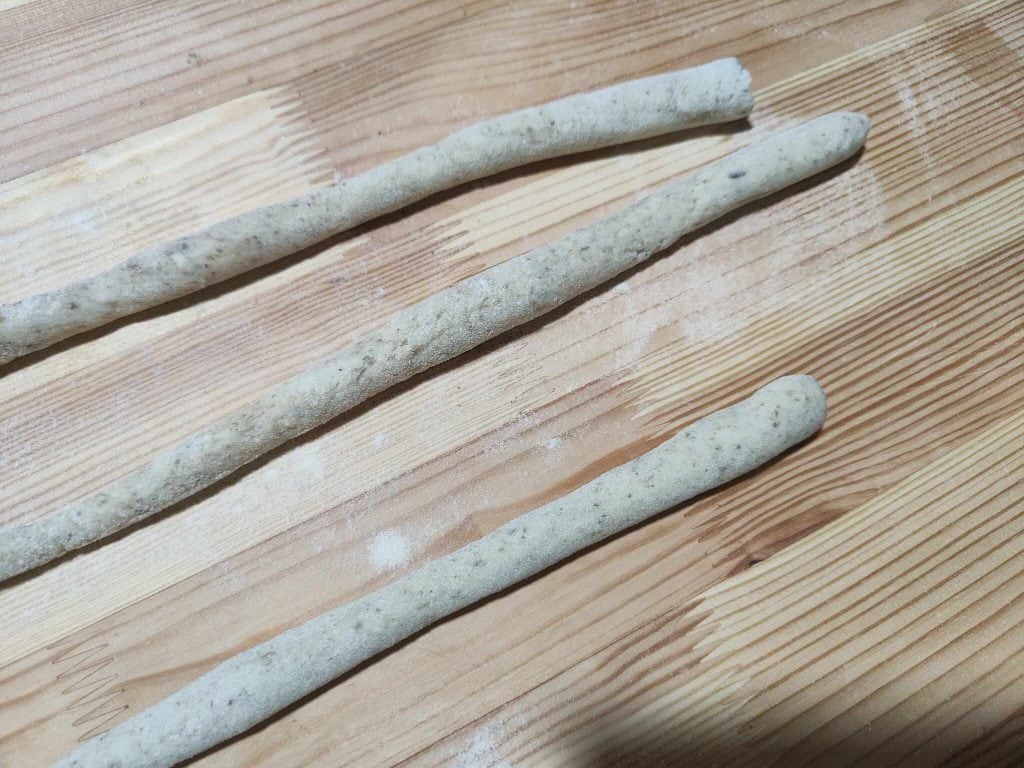 Do pedaço de massa obtido, faça cordões com cerca de 1 centímetro de espessura e corte-os em pedaços de aproximadamente 1 centímetro de comprimento.