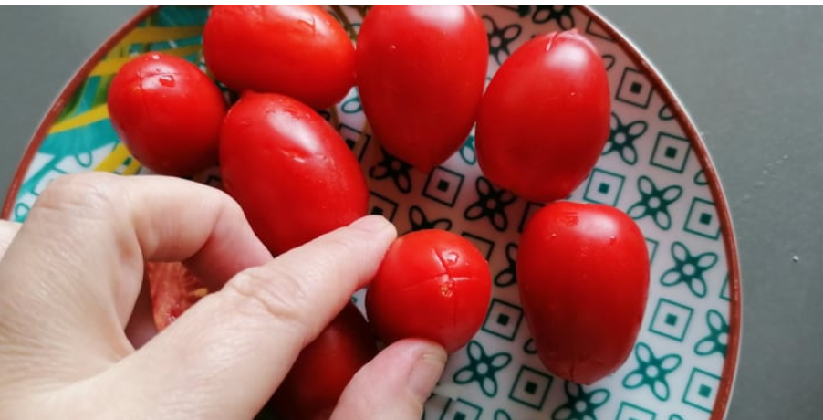 Para preparar o molho, faça um corte em cruz na extremidade de cada tomatinho.