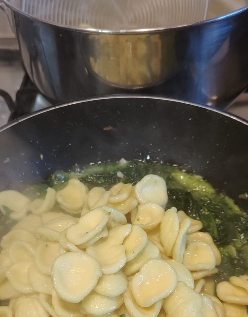 • Salteie as orecchiette com as folhas de nabo na frigideira por alguns minutos.
