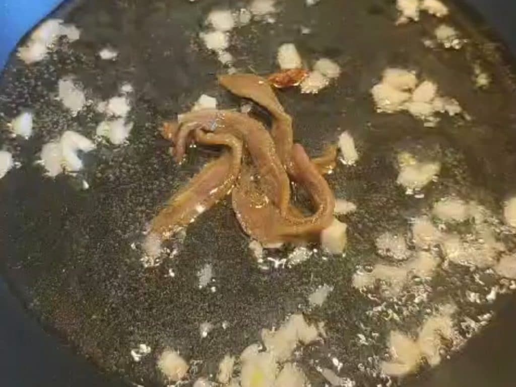 • Enquanto isso, coloque uma generosa quantidade de óleo na frigideira e adicione os dentes de alho picados, aqueça, depois adicione os filetes de anchova, deixe-os derreter em fogo moderado, mexendo com a ajuda de uma colher.