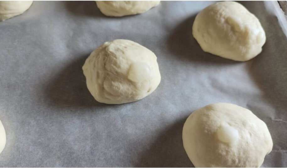 Com as mãos untadas de óleo, pressione-as delicadamente para formar os pãezinhos, deixe crescer por cerca de 1 hora.