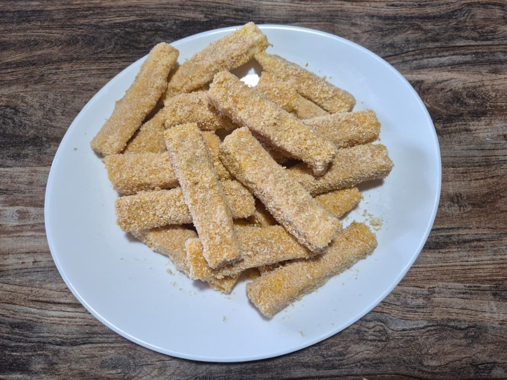 O queijo na panagem criará uma crosta saborosa e perfumada que tornará o palito bom mesmo sem molhos.