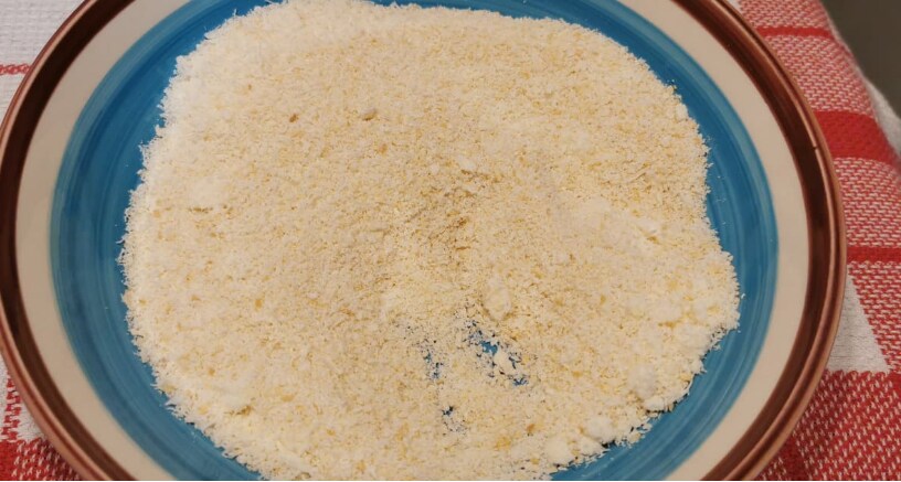 • Em uma tigela, misture o pão ralado com o queijo ralado, a noz-moscada, uma pitada de sal e um pouco de casca ralada de um limão orgânico. Seria bom colocar uma pitada de farinha, mas bem pouca, isso nos ajuda depois no cozimento.