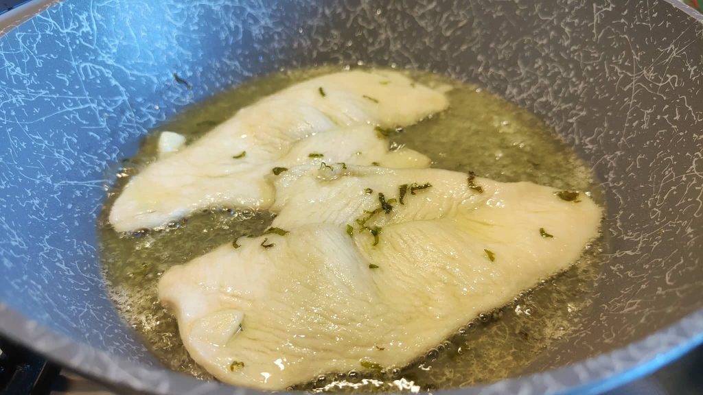 • Adicione o peito de frango enfarinhado e deixe dourar em fogo médio, virando para cozinhar uniformemente de ambos os lados até ficarem douradas. Sal e pimenta.