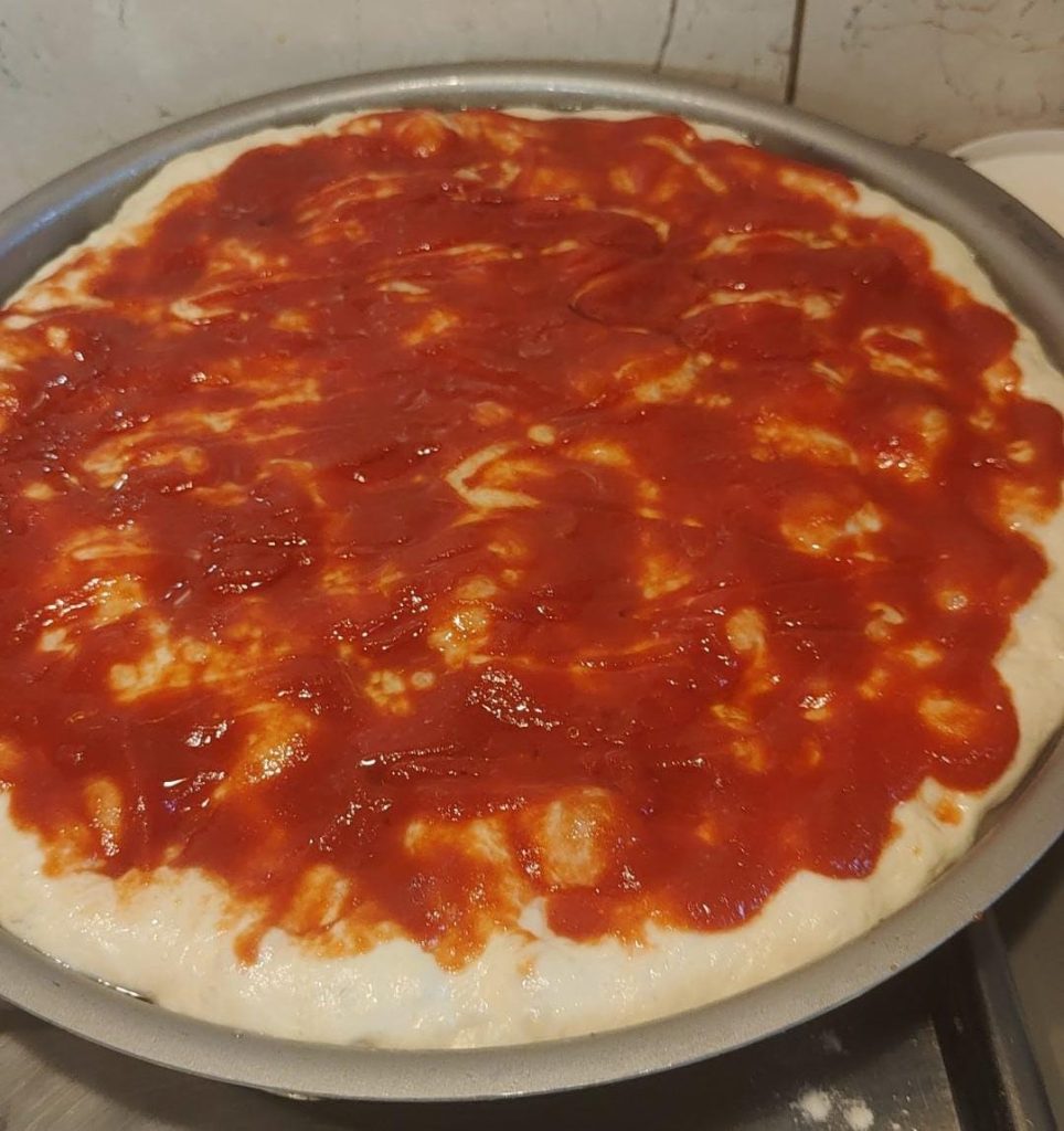 (O molho de tomate é previamente temperado com sal antes de espalhá-lo sobre a pizza).