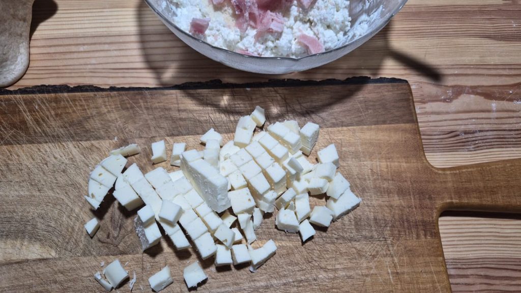 • Corte os frios, a scamorza e o provolone em cubinhos. Bata a ricota com as batedeiras, adicionando os ovos um a um.