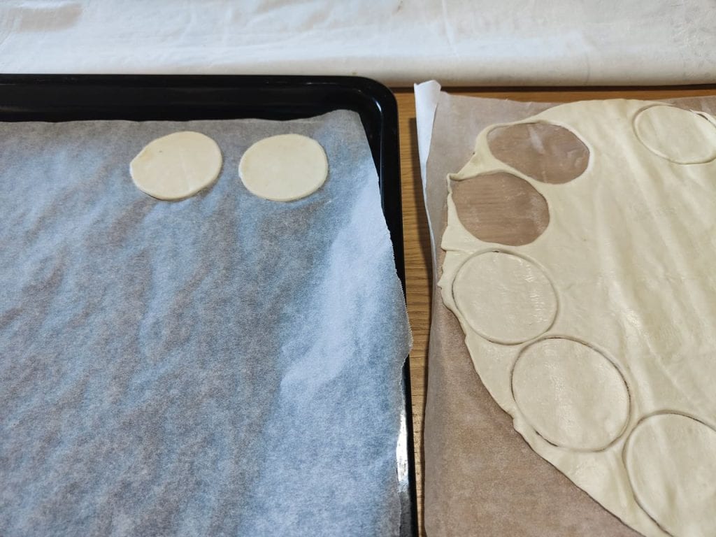 • Para preparar as pizzinhas de massa folhada, comece a estender o rolo de massa folhada, e com um cortador de massa de aproximadamente 7 cm de diâmetro, corte discos.