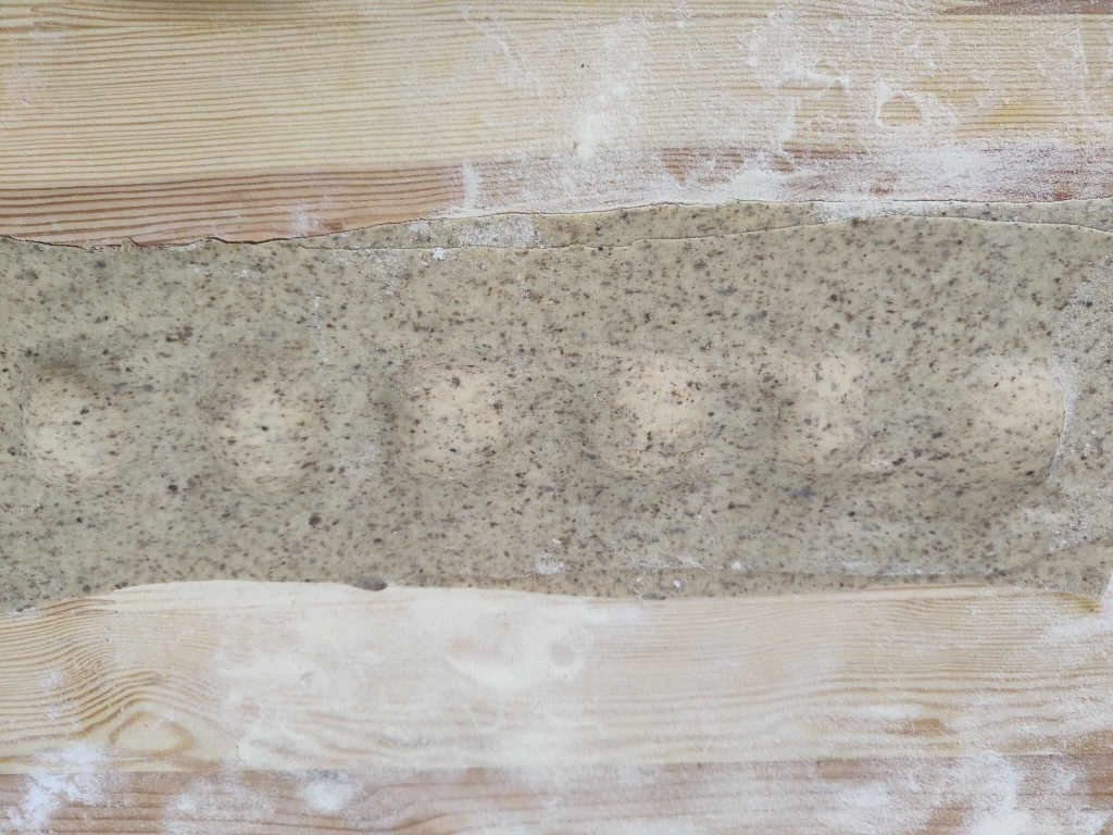 Coloque pequenas porções de recheio afastadas entre si 2-3 cm, cubra com outra folha de massa e pressione para retirar o ar.