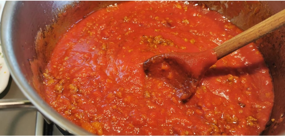 Reduza o fogo ao mínimo, cubra a panela em três partes e deixe cozinhar por cerca de 2/3 horas. O molho deve cozinhar suavemente em fogo baixo.