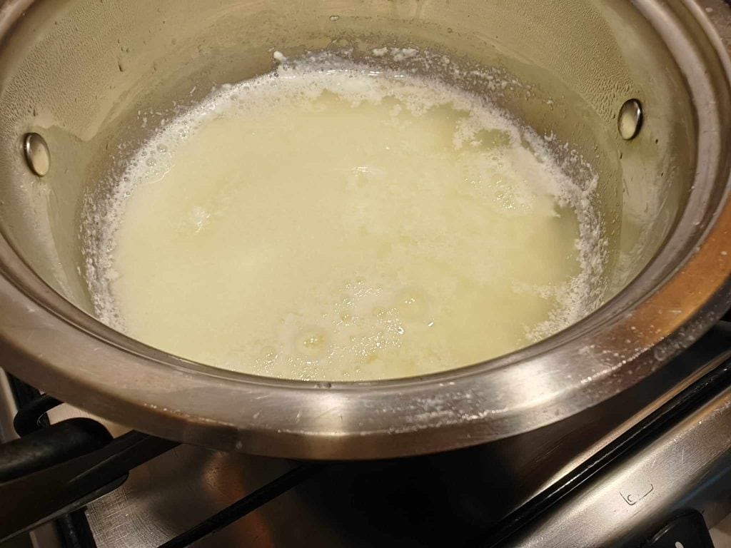 Despeje o leite em uma panela pequena e leve à temperatura de 90°C, depois desligue o fogo e afaste a panela do fogão.