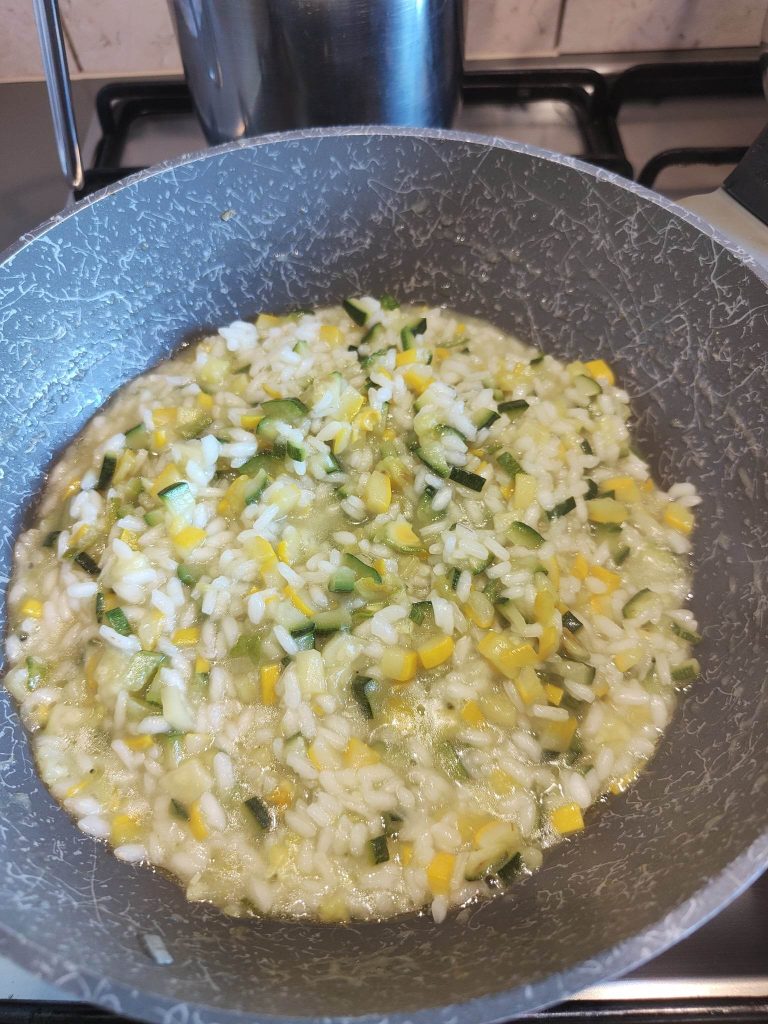 Chegando em casa, pensei? E assim surgiu o risoto com flores de abóbora e abobrinha. Eu usei tanto as abobrinhas amarelas quanto as verdes, mas apenas as verdes também funcionam bem.