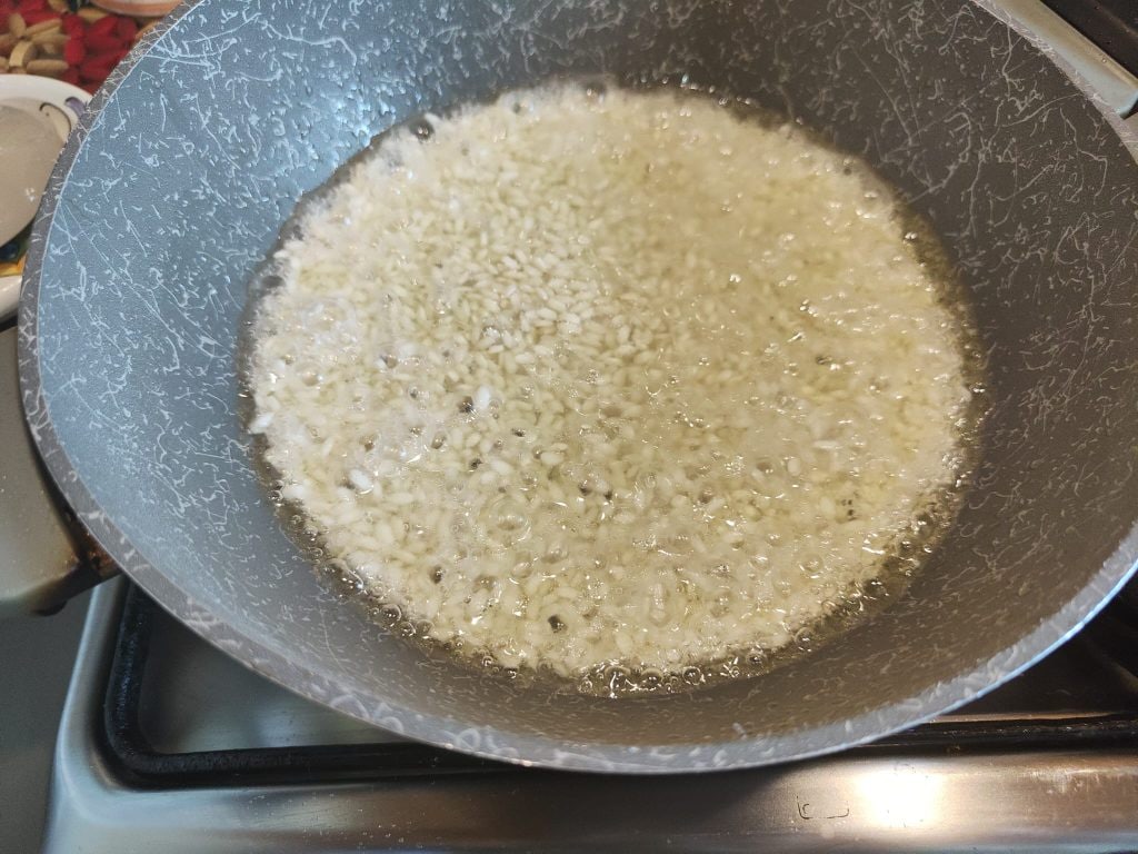 Refogue a cebola em uma panela com azeite de oliva, depois adicione o arroz e toste.