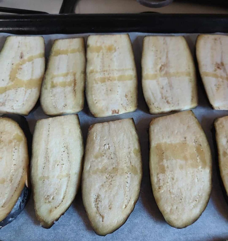 Cozinhe em uma panela (grelhe, frite ou asse no forno) as berinjelas, adicionando sal e pimenta.