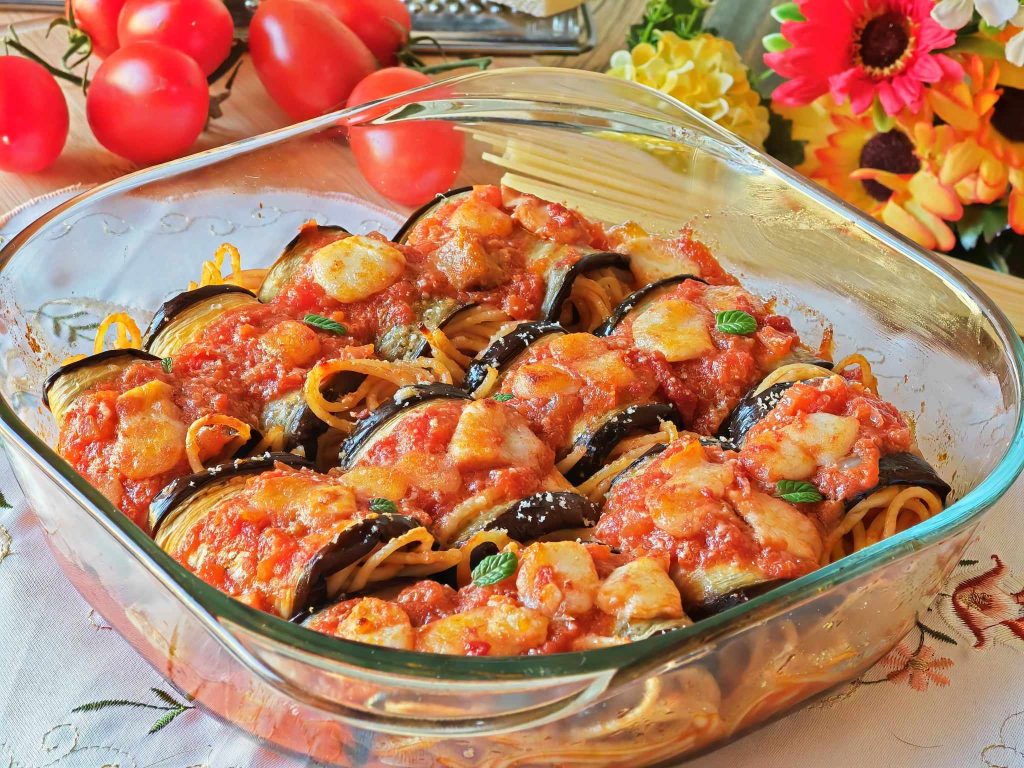 A receita, de certa forma, pode ser definida como macarrão com berinjela e mussarela ao contrário, com as berinjelas envolvendo o espaguete, o resultado são rolinhos deliciosos e muito fáceis de preparar.