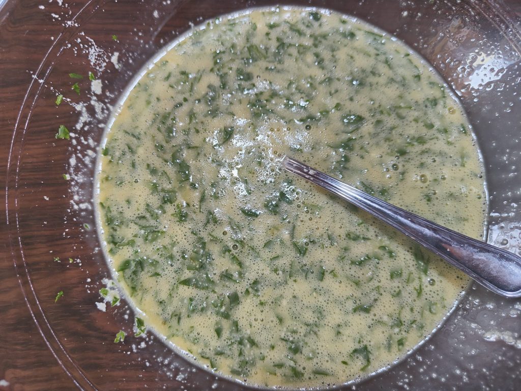Em uma tigela, misture os ovos, a rúcula e o queijo ralado e mexa bem com a ajuda de um batedor.