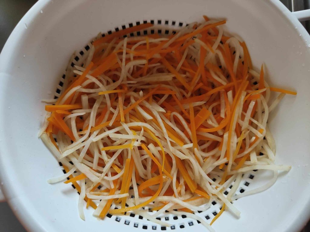Em julienne, ou seja, em palitos muito pequenos, com cerca de 4-5 centímetros de comprimento.