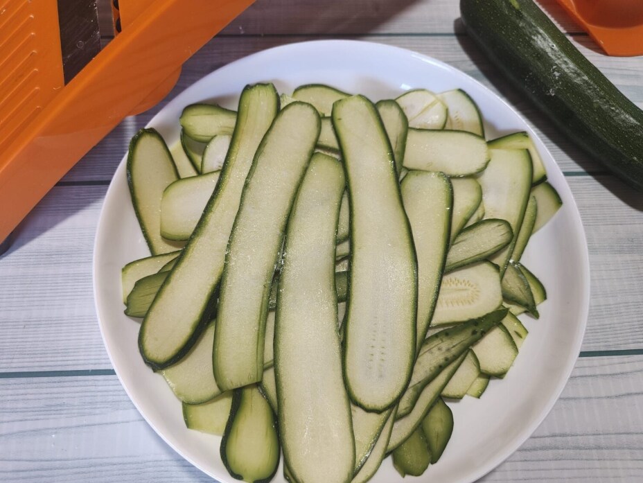 Lave as abobrinhas e corte-as em fatias finas no sentido do comprimento, usando uma mandoline ou faca bem afiada.