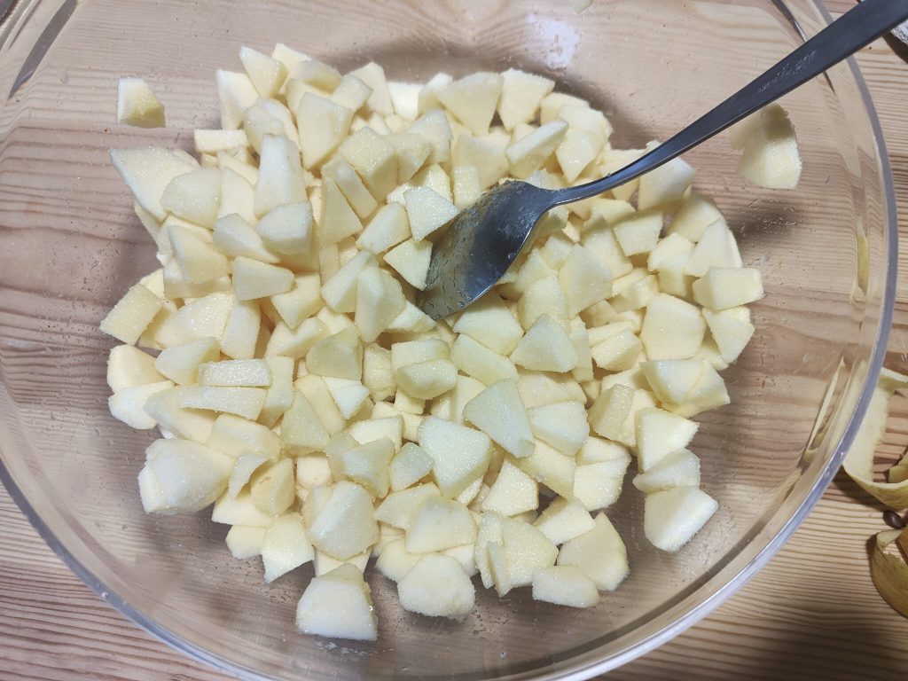 Depois de temperar as maçãs, elas podem soltar um pouco de líquido no fundo da tigela. Não despeje esse líquido no strudel! Use apenas os pedaços de maçã, passas e pinhões para evitar que o strudel fique muito úmido por dentro.