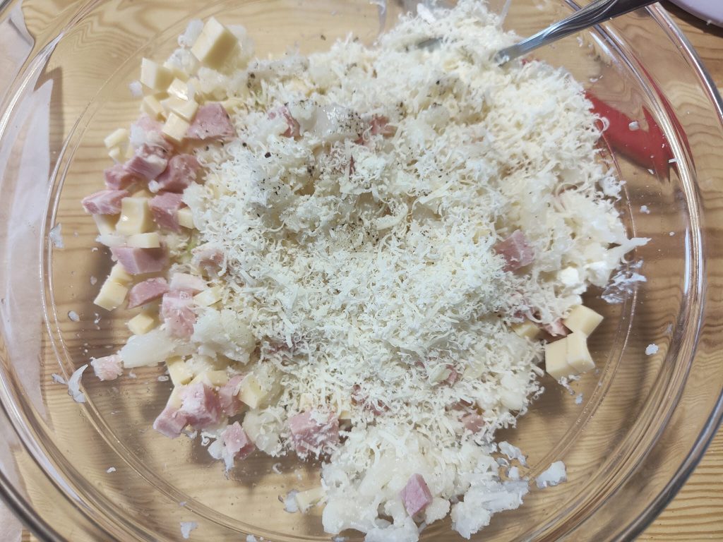 Misture em uma tigela a couve-flor já fria com o presunto, o queijo cortado em cubos, a ricota, um ovo e o queijo ralado.