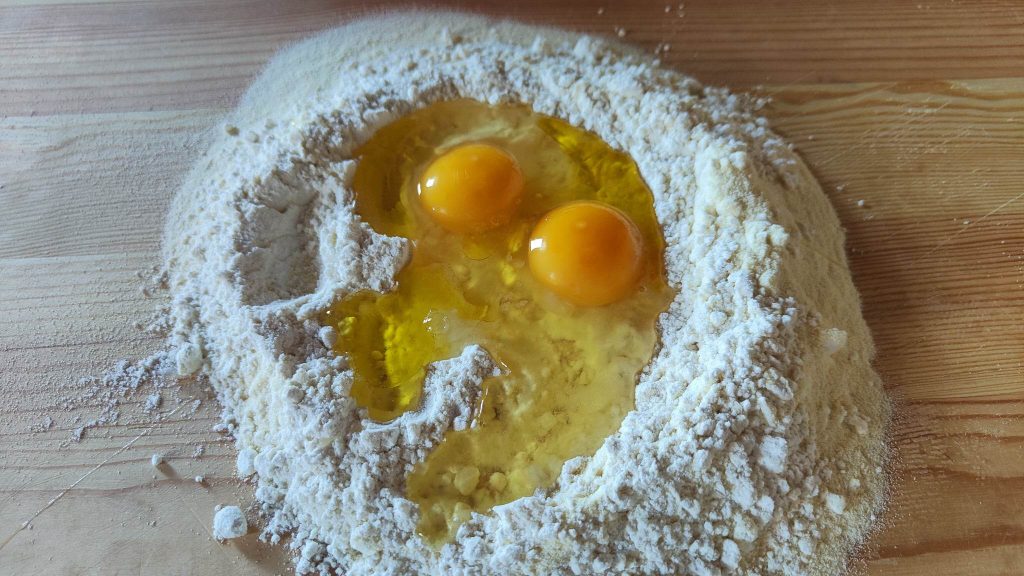 Na superfície de trabalho, forme uma fonte com as farinhas em cujo centro você colocará os ovos e o sal e uma colher de azeite de oliva.