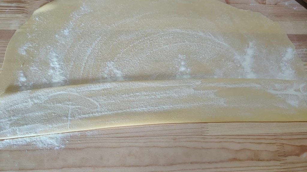 • Uma vez pronta a massa, enfarinhe abundantemente a superfície e depois enrole a massa sobre si mesma. Corte o rolo em fatias finas.