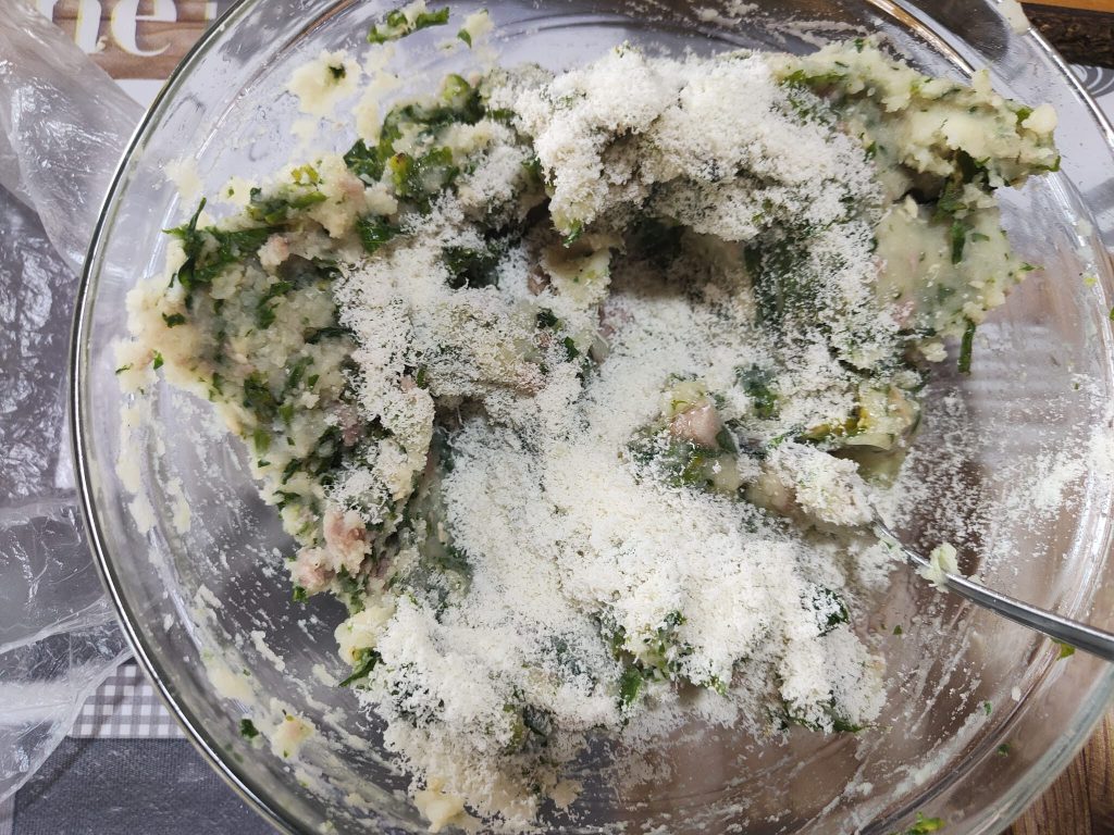Em uma tigela onde temos as batatas amassadas, adicione as linguiças cortadas em pedaços pequenos, os friarielli picados, a provola fatiada, o queijo ralado e, por fim, os ovos.