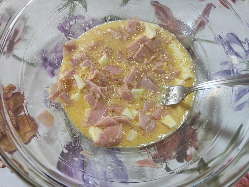 • Bata os ovos, adicione três colheres de sopa de leite, o parmesão e por último o presunto cozido e a muçarela cortada em cubos, sal e pimenta levemente.