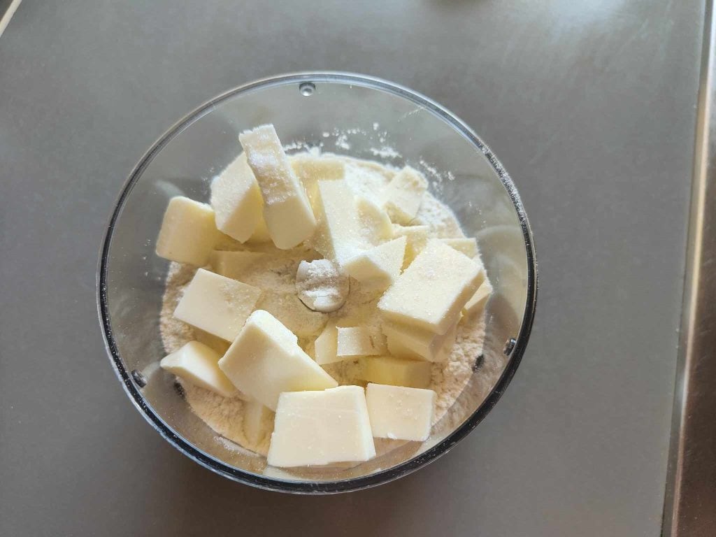• Coloque a manteiga fria em pedaços no mixer junto com a farinha.