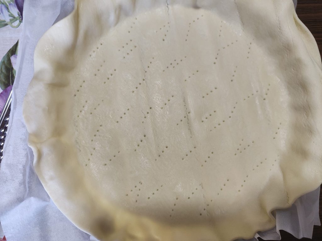 Enquanto isso, desenrole a massa brisée deixando o papel manteiga por baixo, coloque-a em uma forma redonda de 24/26 cm para tortas salgadas ou tortas doces e deixe-a preparada na mesa.