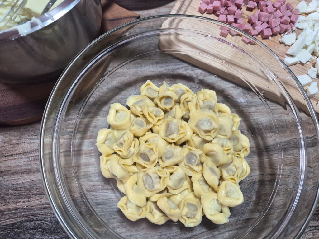 Nesta versão, os tortellini se encontram com a suavidade aveludada do bechamel e o sabor marcante dos cubinhos de presunto cozido, tudo coberto por uma gratinagem dourada que esconde um coração derretido.