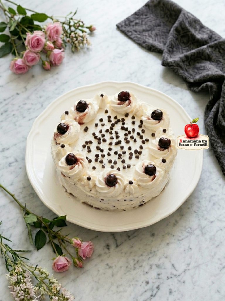 Decore a torta como preferir, colocando em cada roseta de chantilly uma amarena e, no centro, as gotas de chocolate. Leve à geladeira antes de servir.