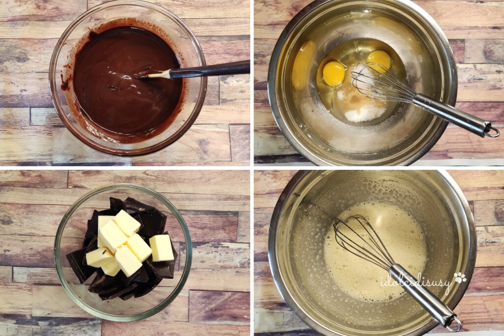 Trito o chocolate amargo, coloco em uma tigela junto com a manteiga em pedaços. Derreto tudo no micro-ondas ou em banho-maria e reservo.