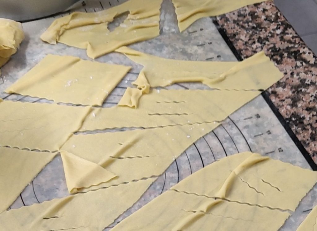 Estenda a massa eu usei a laminadora, um acessório da minha batedeira Kenwood, mas você pode usar a máquina de massa clássica, e crie retângulos e com o cortador faça cortes no centro.