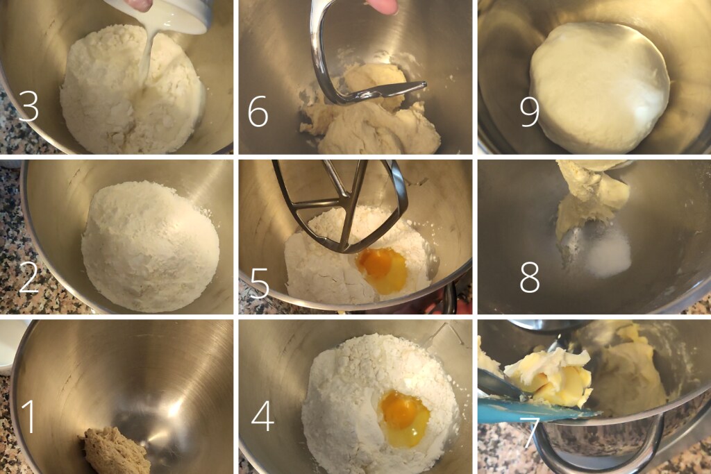 Coloco o fermento na tigela da batedeira planetária (1) e adiciono todos os ingredientes, as farinhas (2), o ovo (3) e o leite (4). Ligo a batedeira com a pá (5) em baixa velocidade apenas para misturar bem os ingredientes. Em seguida, substituo a pá pelo gancho (6) e amasso por cerca de dez minutos, adicionando a manteiga amolecida em pedaços (7) um pouco de cada vez.