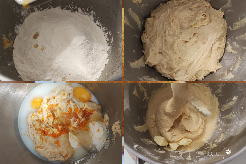 Na tigela da batedeira, coloco o fermento, a água, o leite, o ovo e a gema, o açúcar, a mistura aromática, a casca de laranja ralada e as farinhas. Aciono a batedeira equipada com o gancho folha e começo a trabalhar a massa em velocidade moderada. Quando a massa começa a tomar forma e a se compactar, substituo o gancho pelo gancho de gancho. Aciono em velocidade moderada e começo a incorporar a manteiga amolecida em pedaços aos poucos, por último adiciono o sal. A massa está pronta quando se incorpora, quando sobe pelo gancho.