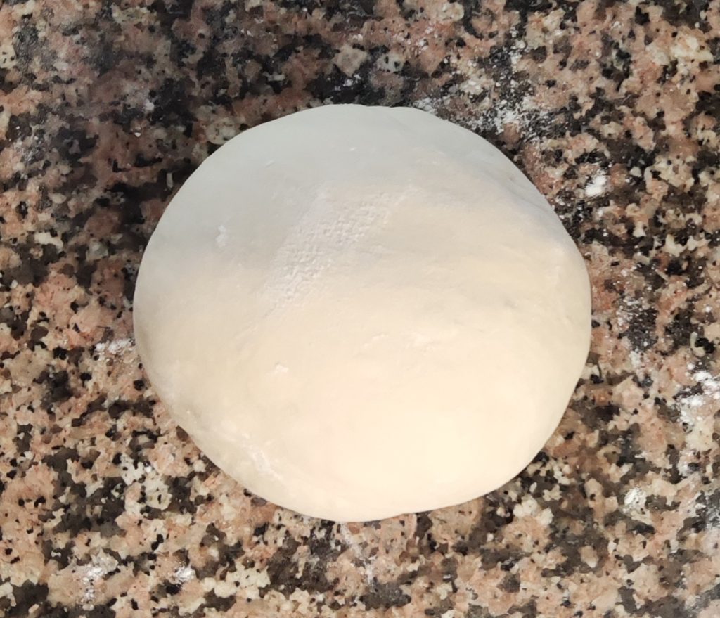 Levo a parte superior do retângulo para o centro, dobro a parte inferior fechando como um livro, criando um retângulo menor.Depois dobro o lado direito em direção ao centro e fecho com o outro lado como um livro. Viro e inicio a boleação, giro a massa com as mãos enfarinhadas dando-lhe a forma esférica.