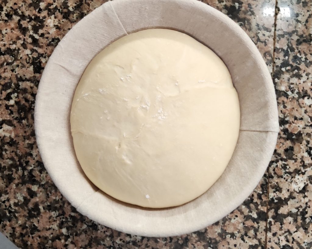 Deixo fermentar na cesta com o fechamento das dobras para cima por cerca de 6 horas, até dobrar de volume.