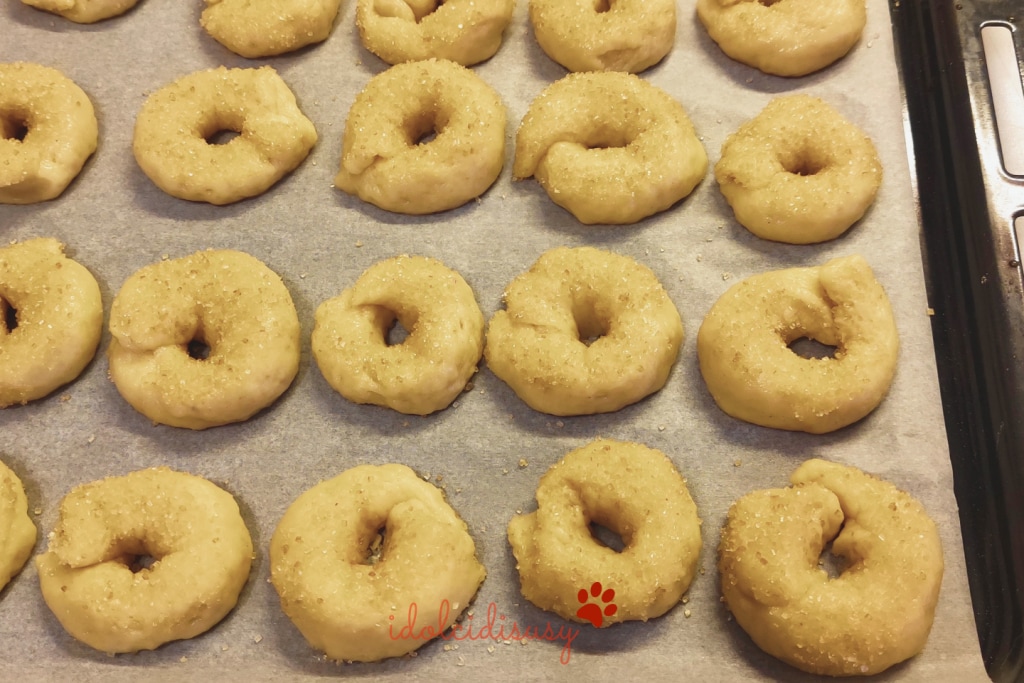 Passo cada rosquinha no açúcar e coloco em uma assadeira forrada com papel manteiga.
