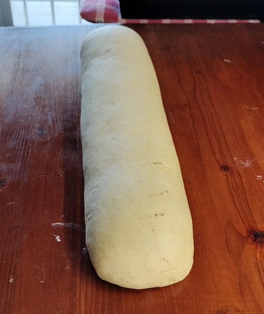 Nossa massa cresceu, viro-a sobre a bancada levemente enfarinhada e com a ajuda do rolo, formo um retângulo.
